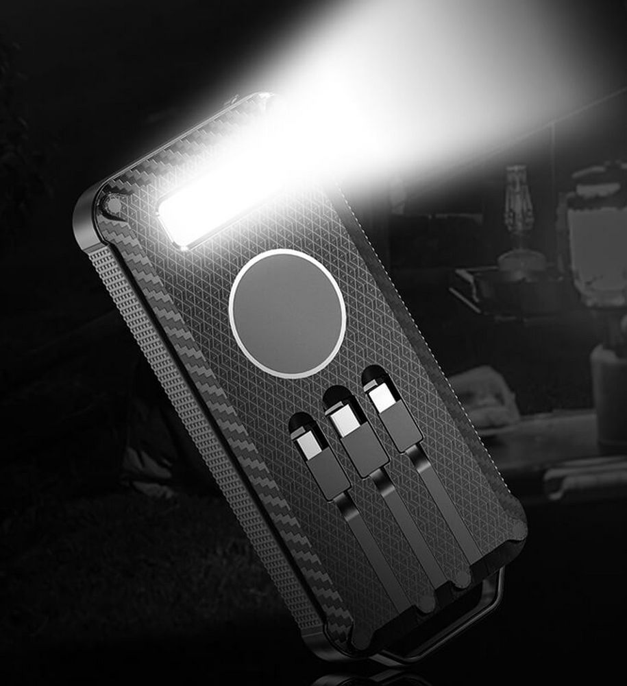 Total Control — настоящий outdoor-аккумулятор с ударопрочным корпусом и защитой от пыли и брызг, который не страшно взять в поход. Область для беспроводной зарядки и 3 встроенных кабеля с разъемами Micro USB, Type C и Lightning позволяют удобно заряжать разные типы устройств, а солнечная батарея просто не позволит остаться совсем без связи. Яркий фонарик осветит путь или послужит светильником в палатке.