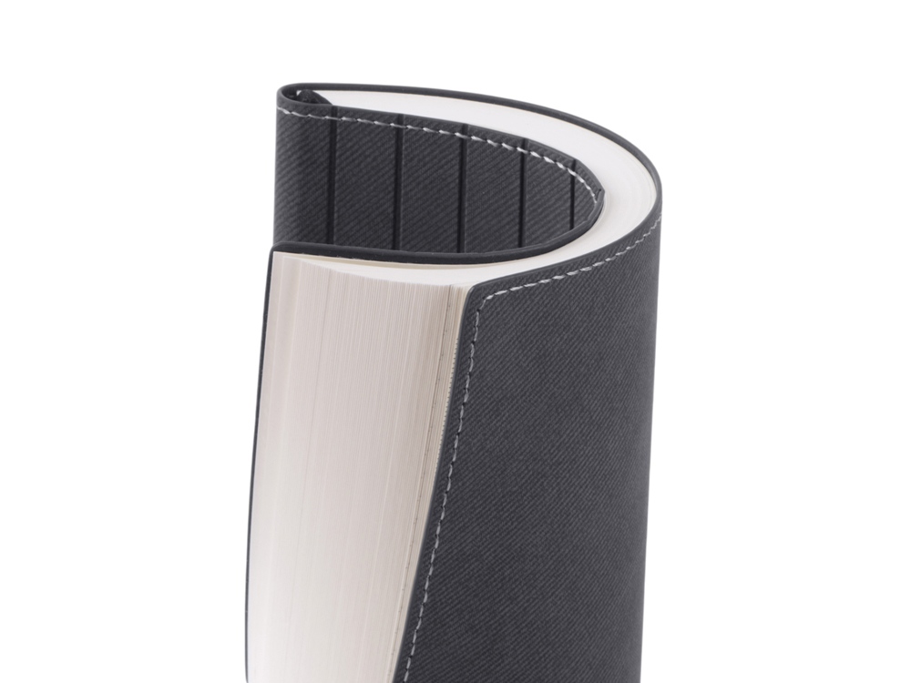 Необычный офисный блокнот станет прекрасным деловым мерчем. Гибкая текстурная обложка позволяет выполнить нанесение в двух вариантах - на самой обложке и на однотонном патче в правом нижнем углу. Внутри блокнота 80 листов кремовой бумаги повышенной плотности 80 г/м2 с FSC сертификатом.. Линовка основного блока в линейку, в конце по 4 страницы в клетку, в точку и нелинованные + 1 страница с линейкой. - ляссе в тон обложки; - формат А5; - бумага с сертификатом ответственного лесопользования FSC.