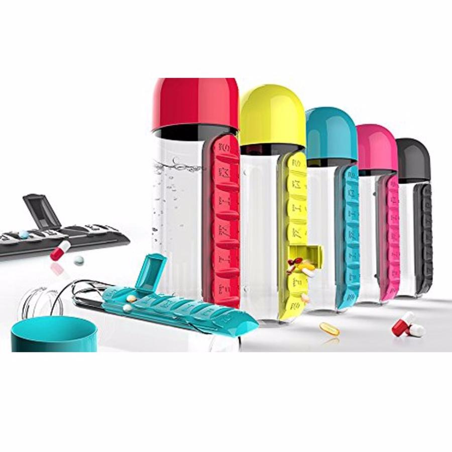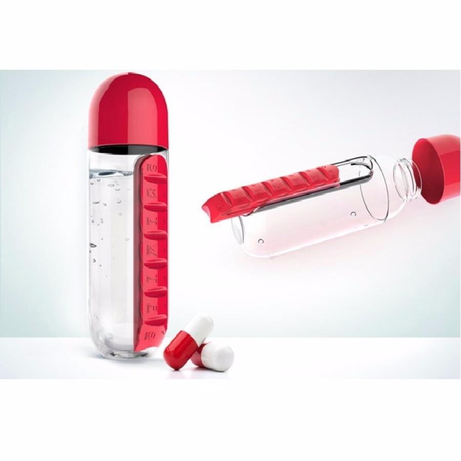 Не все, к несчастью, от природы наделены крепким здоровьем, но позитивные моменты можно найти и здесь. Вы только посмотрите на это веселый органайзер для таблеток! На бутылочке для воды сбоку расположен мини-органайзер с разными отделениями, в которые можно положить необходимые лекарства или витамины.