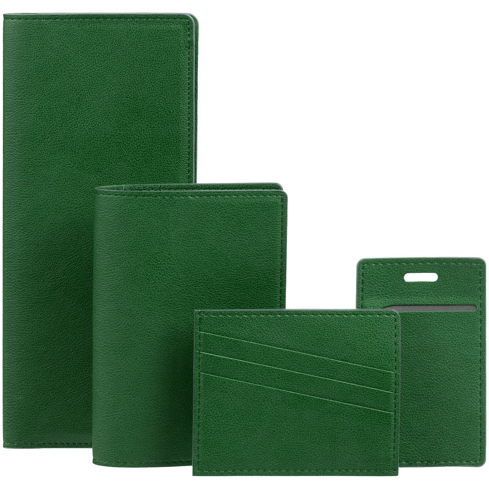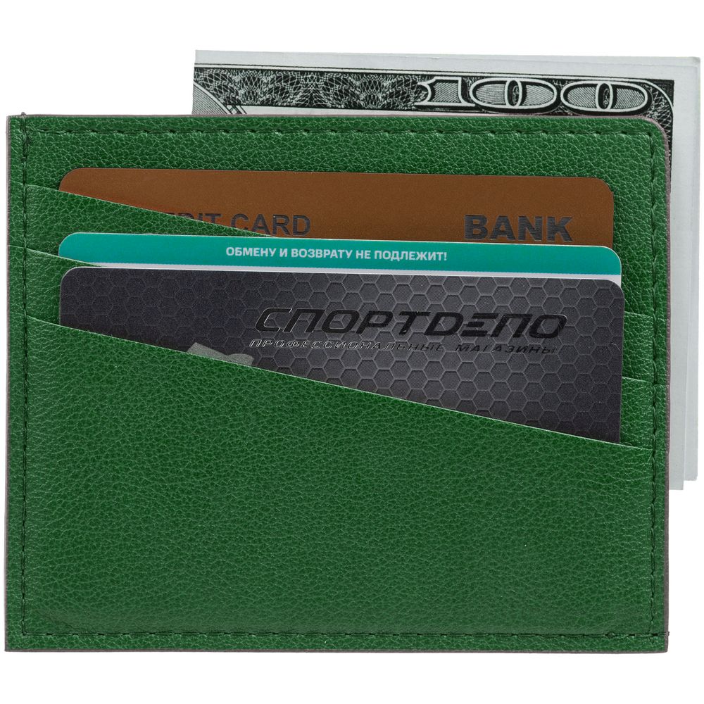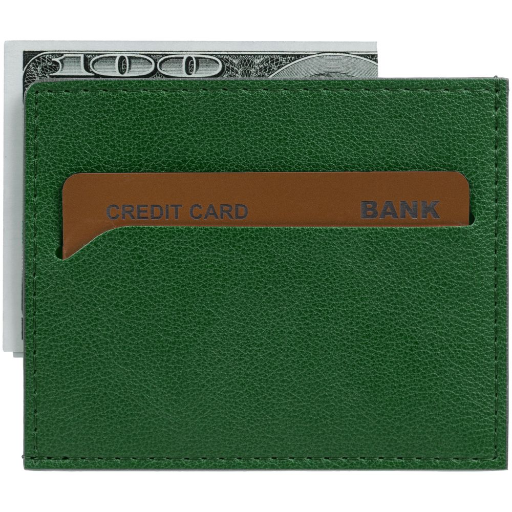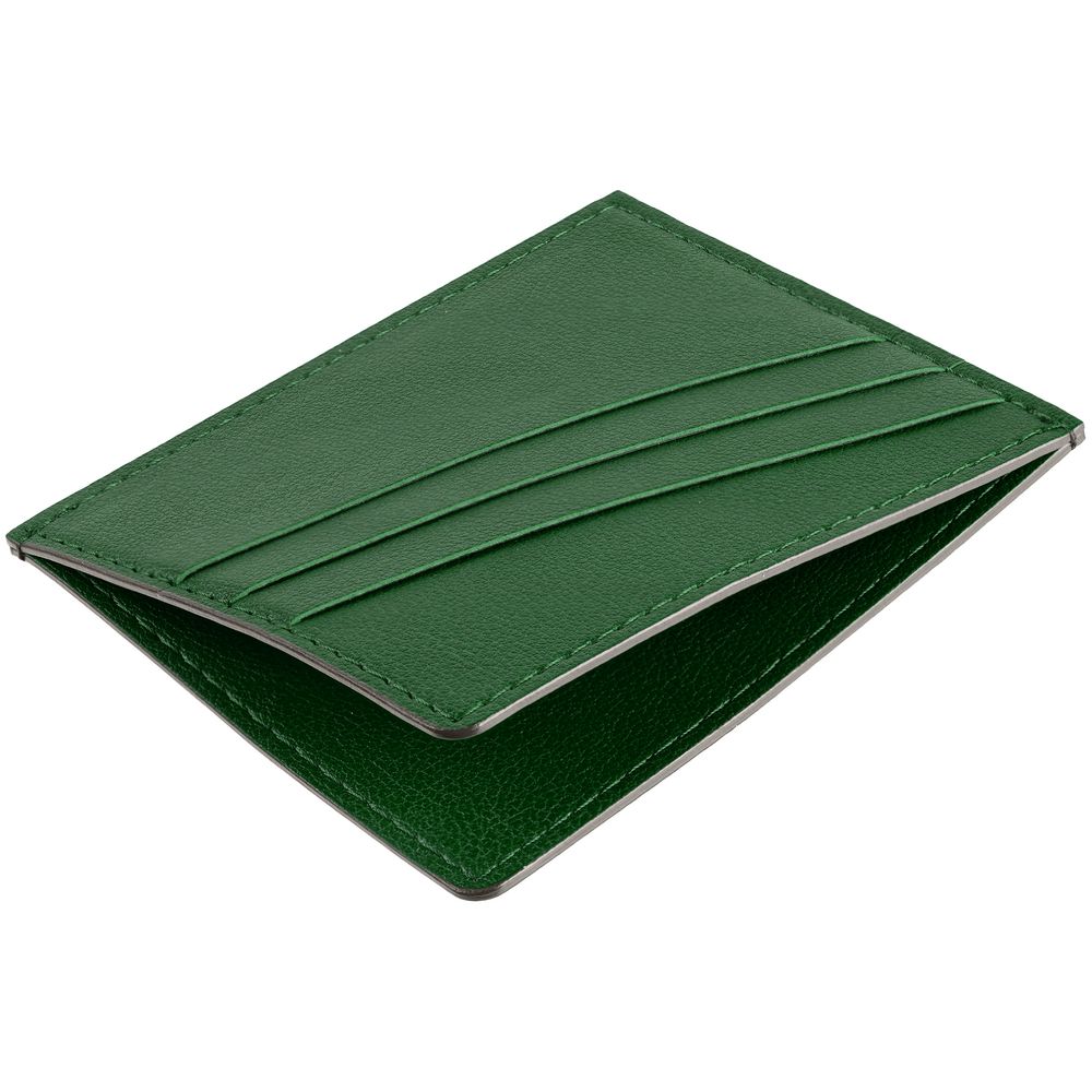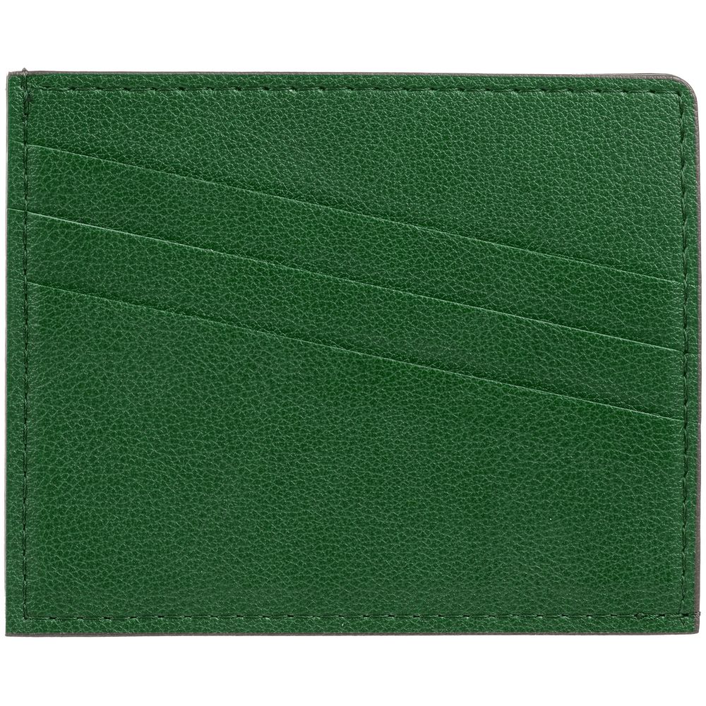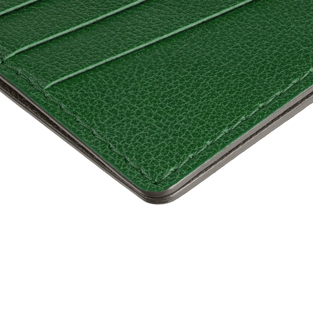 Чехол выполнен из материала Petrus, зеленый FF, дополнен окрашенным срезом края и внутренним карманом из серого картона. Имеет 4 отделения для кредитных карт и 1 отделение для купюр.