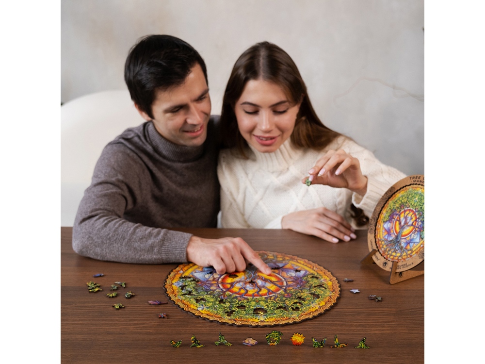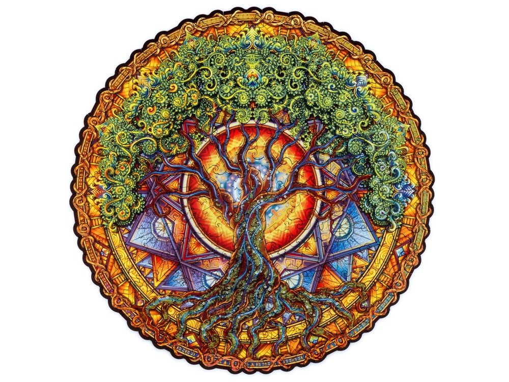 Древние легенды рассказывают, что в самом центре Земли растет удивительное Древо. Его ветви достают до самого неба, корни уходят глубоко в землю, а в тени ствола прячутся цветы и животные. Его величественная крона сплетается с корнями, образуя единый, неразрывный круг — как символ бесконечной жизни. Мы воплотили старинные легенды в нашем пазле Мандала Древо Жизни. Во время сборки вам встретятся бабочки и звезды, птицы и цветы, животные и планеты. А чтобы усилить медитативный эффект, мы добавили два типа абстрактных деталей — жесткие, геометрические и мягкие, плавные. Сквозь всю иллюстрацию тянутся прожилки, по которым словно течет сама жизнь — эти детали пазла сияют, потому что покрыты лаком! Этот же эффект мы повторили на подарочной коробке. В природе ничего не пропадает бесследно — все перерождается, видоизменяется и переплетается. На месте старых листьев появляются новые, а из множества абстрактных деталей в самом центре мандалы — вырастает фигура Древа. Говорят, что прожитая не зря жизнь — та, после которой на свете осталось что-то доброе. Помните про сына, дом и дерево? Наше Древо Жизни — как раз такой символ бесконечного развития, связи всего живого на земле, под землей и на небе. Его можно собрать отдельно, а потом соединить с остальным пазлом. Это великолепный подарок — символ перерождения, нового этапа в жизни и надежды на то, что все сложится. - Количество деталей: 200шт. - Размер собранного пазла: 25х25см - Длительность сборки: от 4 часов - Детали уникальной формы - Прочные и долговечные детали с безупречным сцеплением - Премиальная подарочная коробка из дерева, которую можно персонализировать