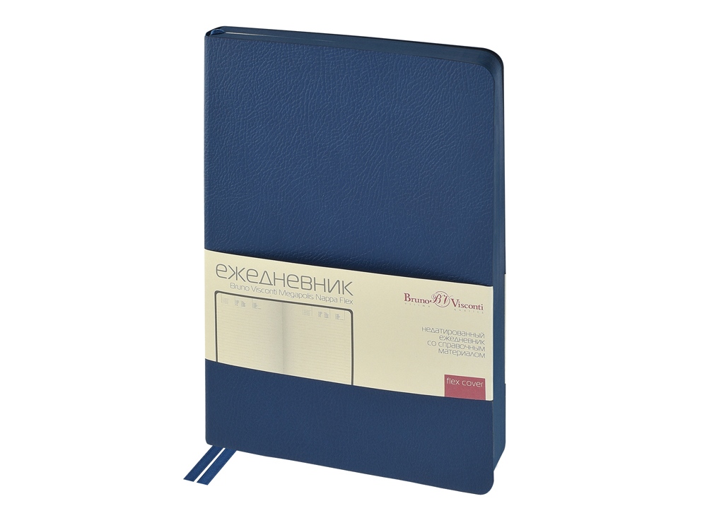 Обложка недатированного ежедневника Megapolis Nappa Flex ТМ Bruno Visconti произведена из искусственной кожи без применения переплетного картона, благодаря чему он легче и изящнее классических. Его можно свернуть в трубочку, обложка и блок не пострадают. При этом, для ежедневника формата А5 доступны те же опции, что и для любых других ежедневников — окрашенный обрез, крупнозернистая фактура искусственной кожи обложки, двойное ляссе 7 мм. Блок изготовлен из бежевой бумаги плотностью 70 г/м2 и помимо раздела для планирования рабочего времени включает в себя 12 страниц справочной информации.