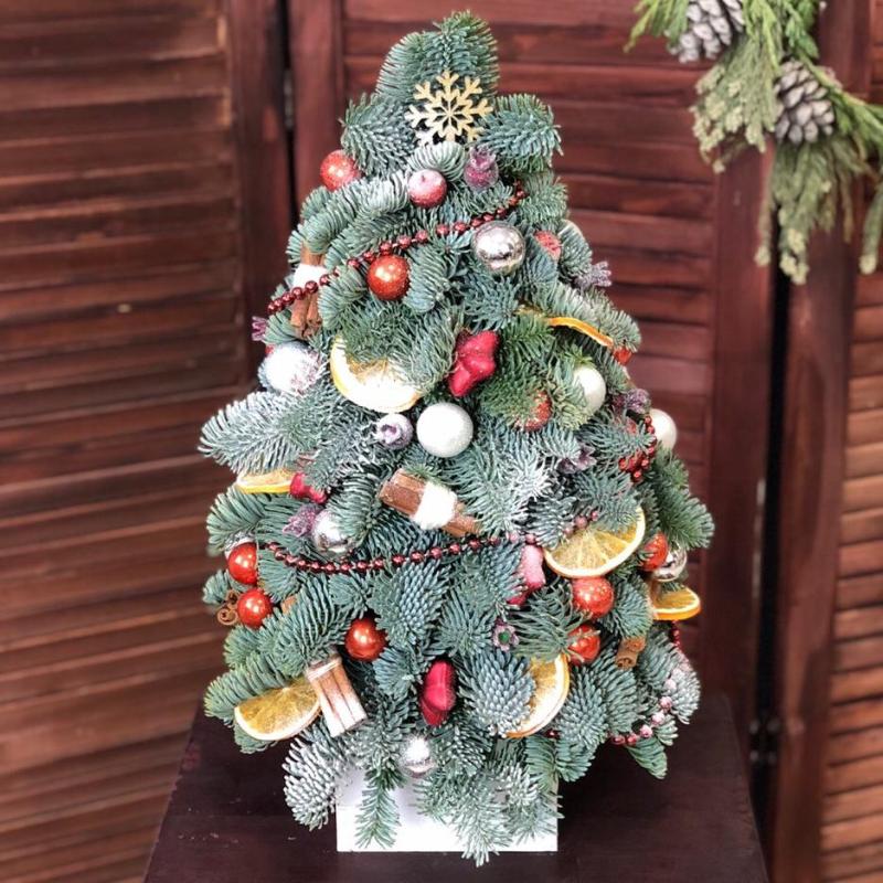 | Состав | основа - флористическая губка; шишки, новогодние шарики, корица, апельсины |