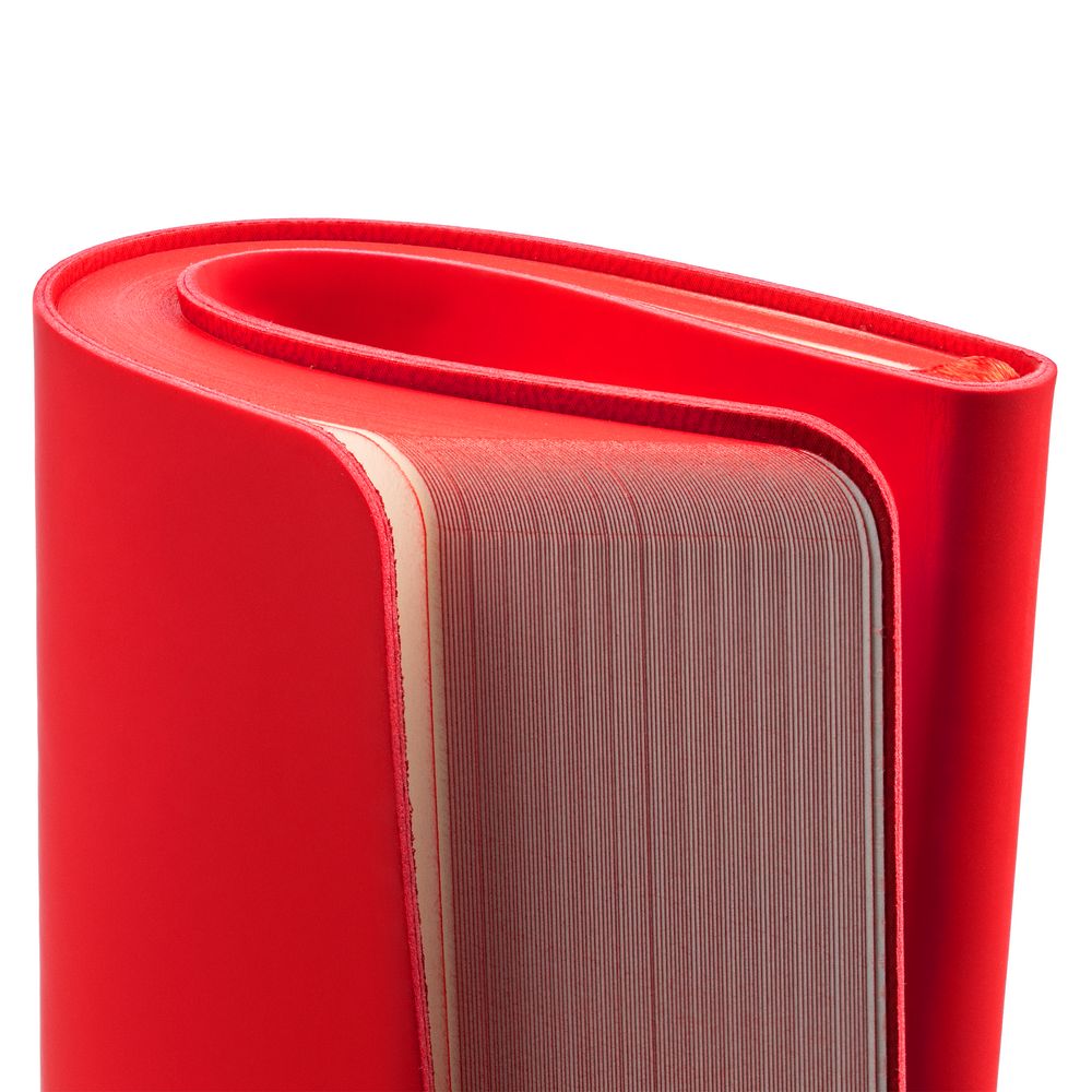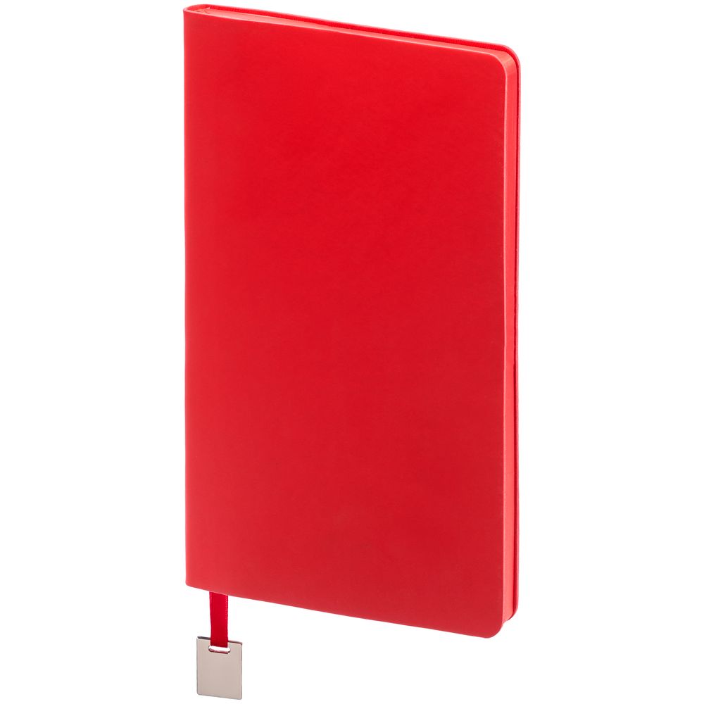 Ежедневник с гибкой обложкой, выполнен из материалов Soft Touch Ultra, красный РР, и Latte, красный (внутренняя часть обложки), дополнен ляссе в цвет обложки с металлическим шильдиком.