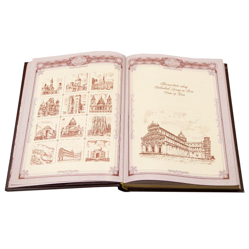 | Оформление блока | из дизайнерской бумаги, с видами шедевров мировой архитектуры с описанием на русском, английском и немецком языках |