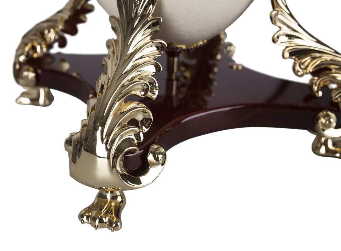 • Уникальный предмет сервировки стола, напоминающий яйцо Фаберже на золотой подставке, выполнен вручную лучшими испанскими мастерами. Примечательно, что в центре композиции находится настоящее страусиное яйцо, покрытое эмалью и расписанное золотом в дамасской технике