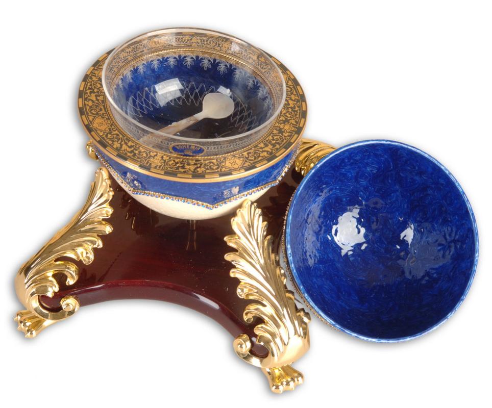 • Ваза для икры выполнена из скорлупы яйца африканского страуса и украшена тонким слоем эмали и камнями Сваровски