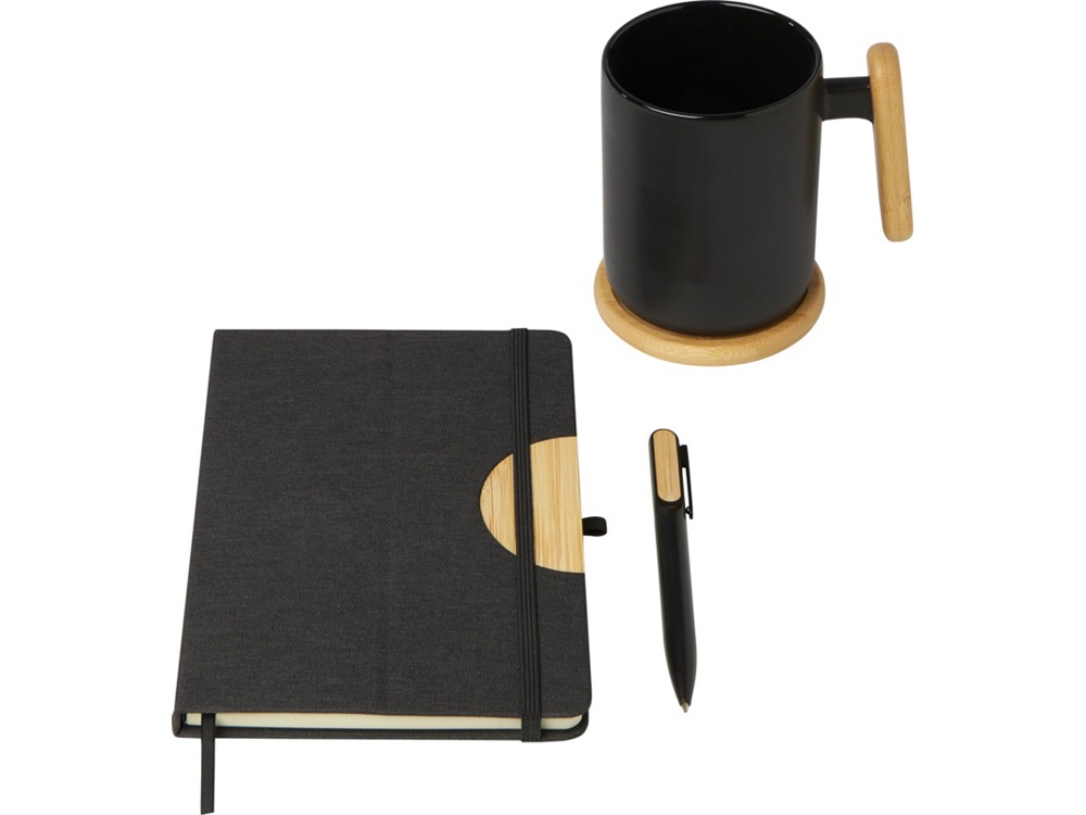 В подарочный набор Laura входит блокнот в твердой обложке RPET формата A5, шариковая ручка, керамическая кружка и подставка. Блокнот имеет черную эластичную застежку и ленточную закладку, а также 80 разлинованных листов бумаги плотностью 80 г/м² кремового цвета. Чехол для ноутбука вместе с бамбуковым полукругом выполняет функцию подставки для телефона. Шариковая ручка изготовлена из переработанного алюминия, сертифицированного RCS, с черным напылением и имеет бамбуковые аксессуары с обеих сторон верхнего корпуса. Чернила для ручки: черный. Длина непрерывной линии: 400 метров. Керамическая кружка объемом 480 мл поставляется с бамбуковой подставкой. Мыть только вручную. Размер кружки: 11 х 12,7 см. Диаметр подставки: 9,5 см. Размер подарочной коробки: 32 x 27 x 10,3 см. FSC certified paper, FSC certified cardboard, Recycled Aluminium. #?0:>2:0: FSC Mix Credit P5.1 CU-COC-877277. FSC Mix Credit P7.1 CU-COC-877277.