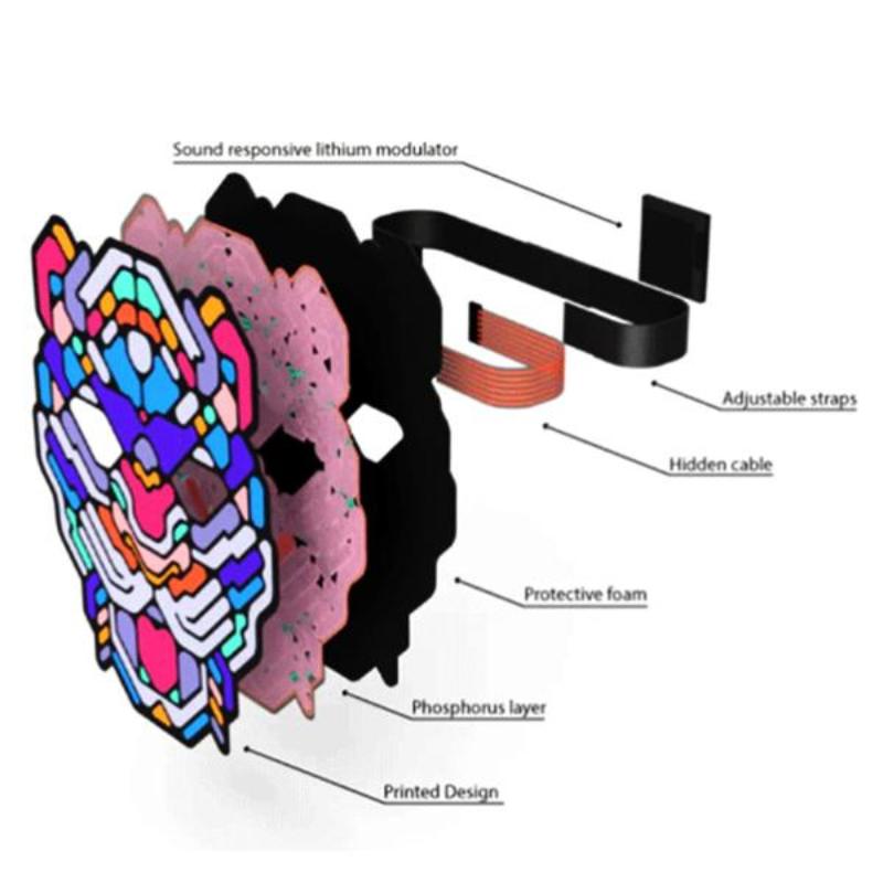 | Особенности | светодиодная маска состоит из фосфорных чернил, материал потребляющий минимальную мощность, холодный на ощупь и излучающий привлекательное свечение. Модуль маски преобразует звуковые волны в запрограммированный рисунок, излучающий чистый органический свет. |