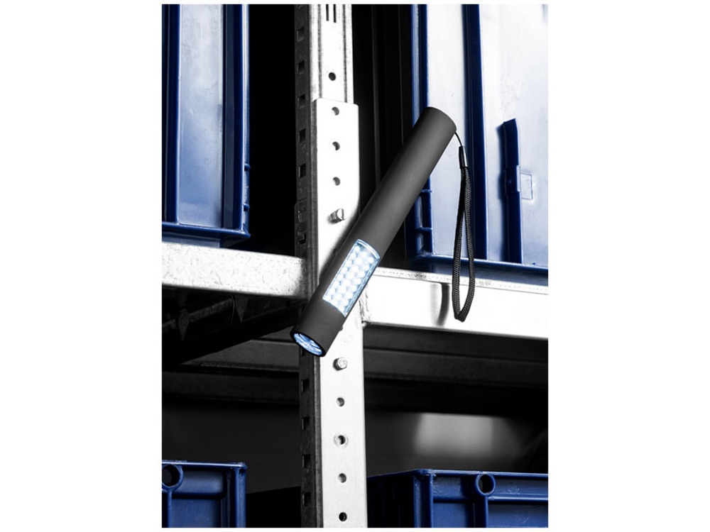 Стильный магнитный фонарик с тремя режимами. Первый режим – 4 осветительных светодиода, второй режим – 24 осветительных светодиода, третий режим – одновременное включения первых двух режимов. Магнитная задняя сторона для удобного хранения или для крепления к металлическим поверхностям во время использования. Кнопка включения/выключения. Нейлоновый ремешок для переноски. Батарейки включены в комплект и вставлены.