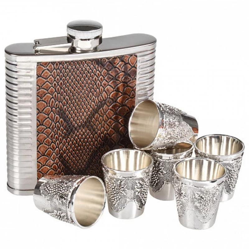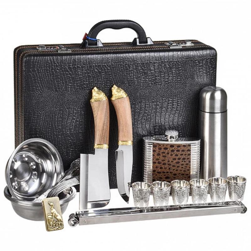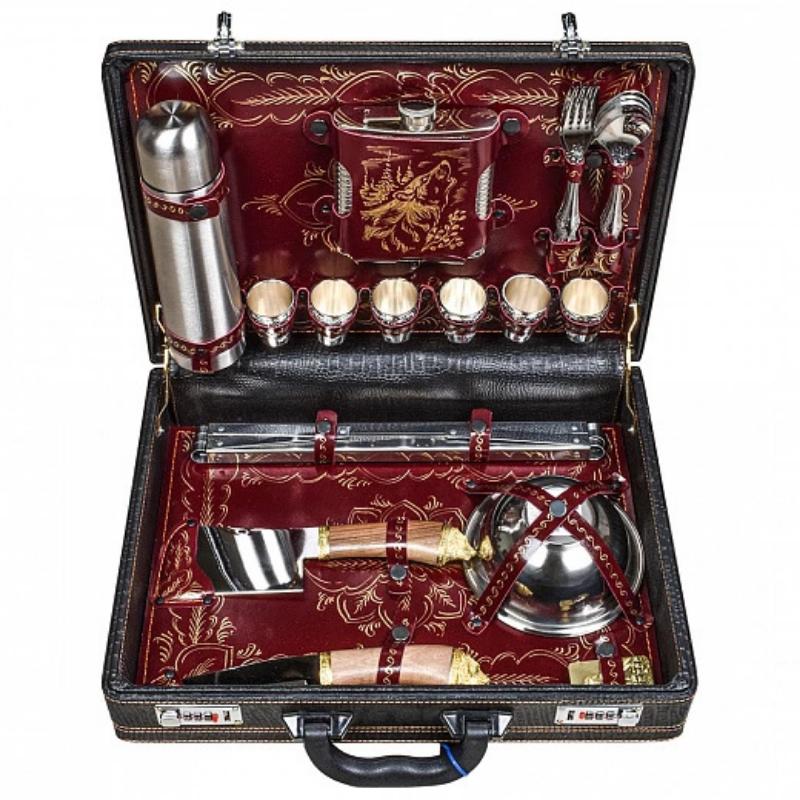 Комплектация Термос 1 шт; Фляжка нерж сталь 1 шт; Вилки нерж сталь 6 шт; Стопки нейзильбер 40 мл 6 шт; Ложка нерж сталь 6шт; Шампуры нерж сталь (35 см) 6шт; Ножки мангала складные нерж сталь 1 шт; Миски нерж сталь 6 шт; Нож универсальный с накладкой медведь латунь 1 шт; Нож-тяпка 1шт с накладкой медведь латунь; Зажигалка-слайдер автоген (накладка собака) 1 шт