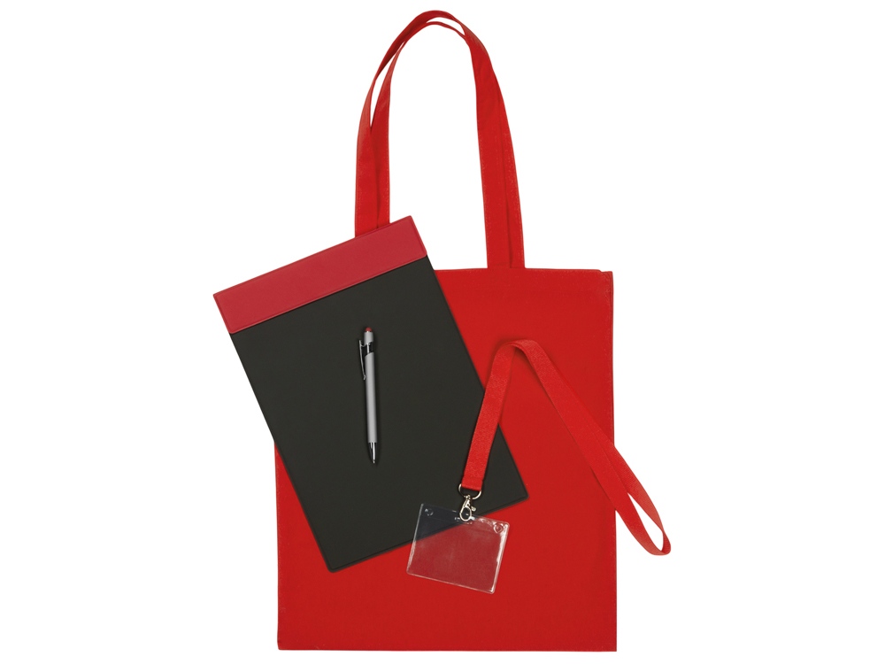 Базовый набор для конференций. В наборе: магнитный планшет для бумаг, ручка для записей, ланъярд и чехол для бейджа участника и шоппер, в который все можно удобно сложить.