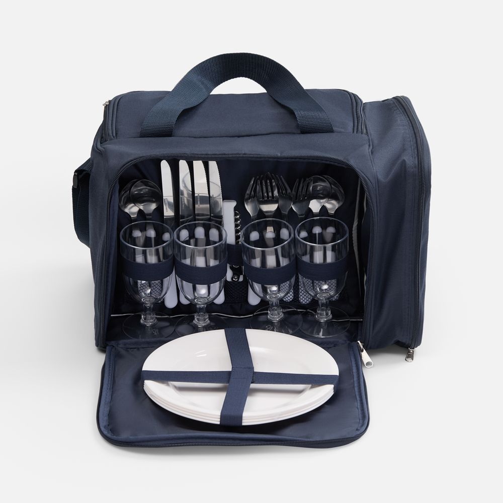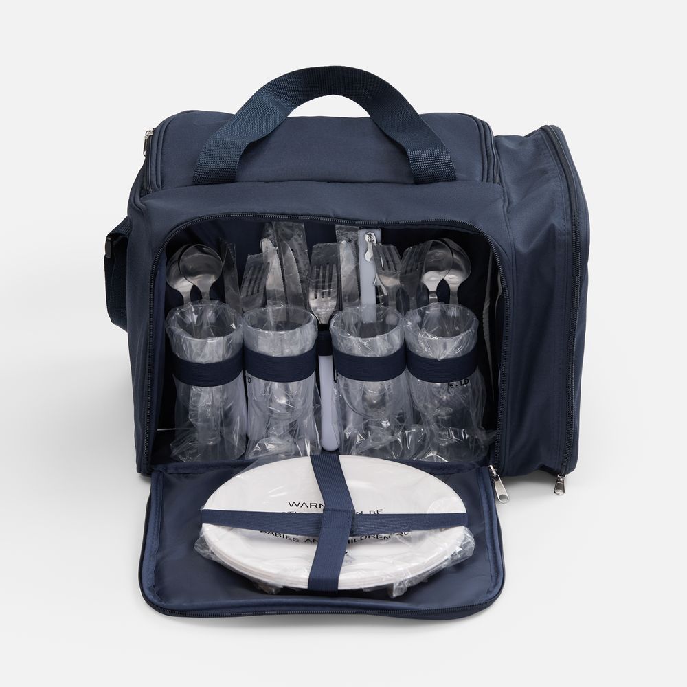 | Материал | термосумка - полиэстер, плотность 230 г/м², PEVA; тарелки и бокалы - полистирол; приборы - нержавеющая сталь, пластик |