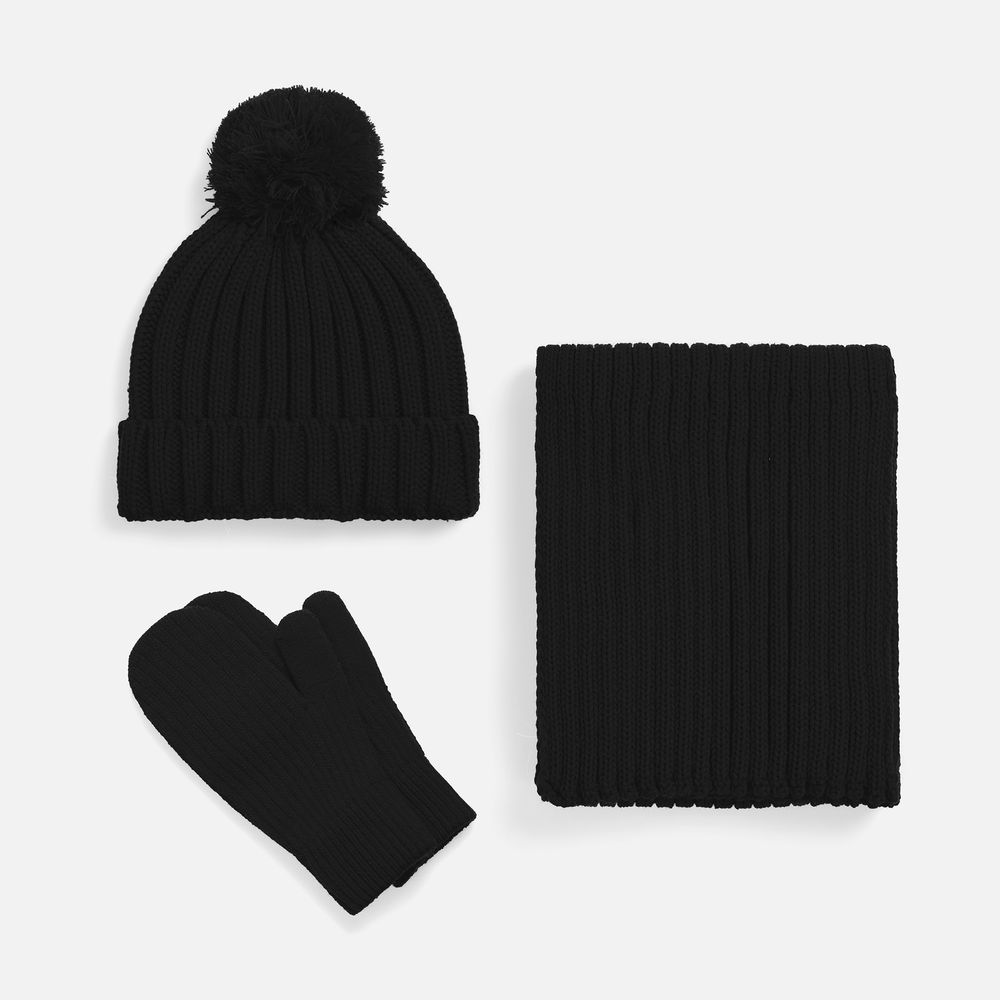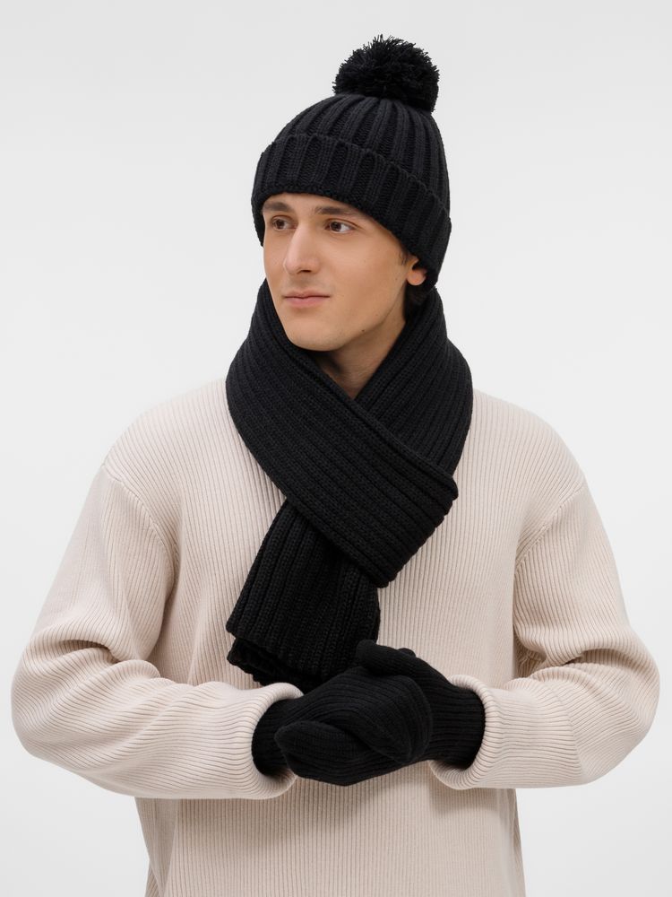 Шапка с пышным помпоном и отворотом, связанная крупной резинкой создает игривый силуэт, а широкий шарф с выразительной текстурой надежно защищает от ветра, сохраняя свободу движений. Варежки с отворотом-резинкой плотно облегают запястье, не пропуская холод.