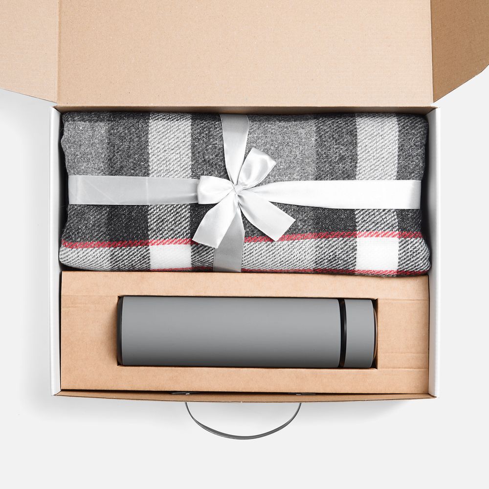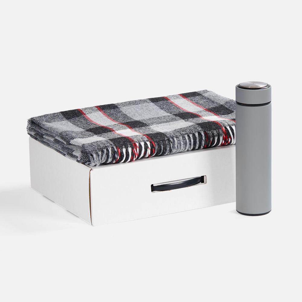 Материал плед - шерсть, 15%; хлопок, 5%; полиэстер 60%; акрил, 20%, плотность 200 г/м²; термос - нержавеющая сталь, 304; покрытие софт-тач; коробка - картон