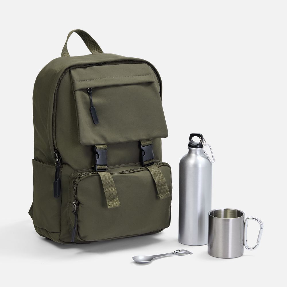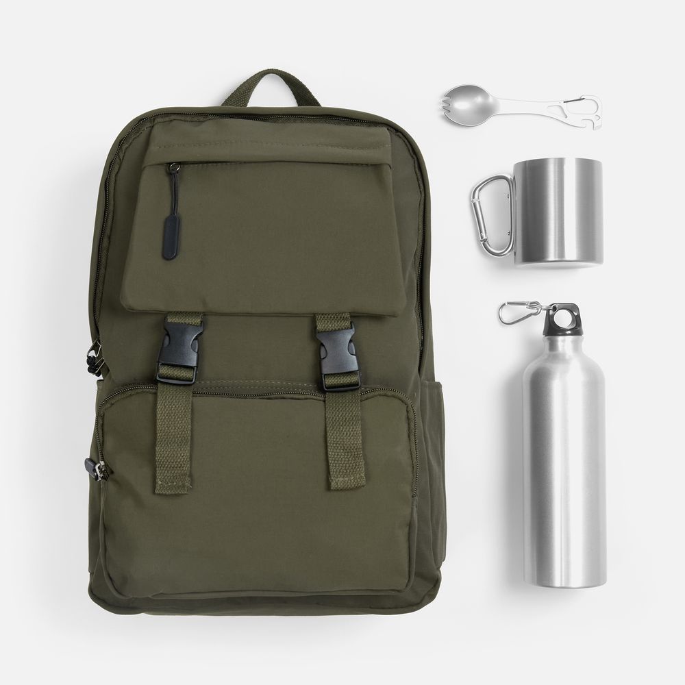 Материал рюкзак - нейлон; кружка - пищевая сталь, 304, внутри - нержавеющая сталь, 201; бутылка - алюминий; столовый прибор - нержавеющая сталь, 420