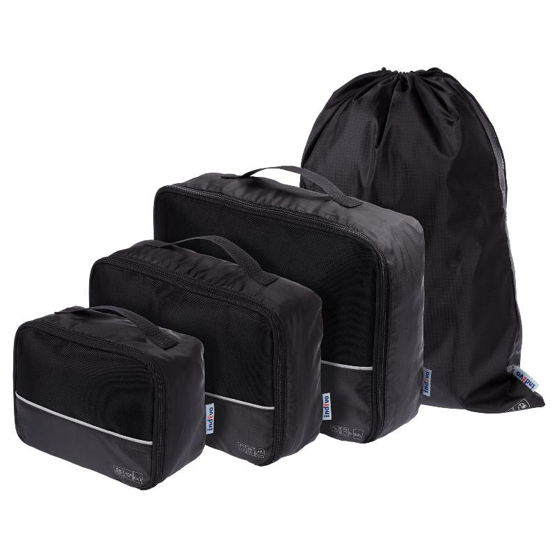 | Набор состоит из 4 предметов | сумка для рубашек и брюк, сумка для футболок и шорт, сумка для нижнего белья, мешок для использованного белья. |