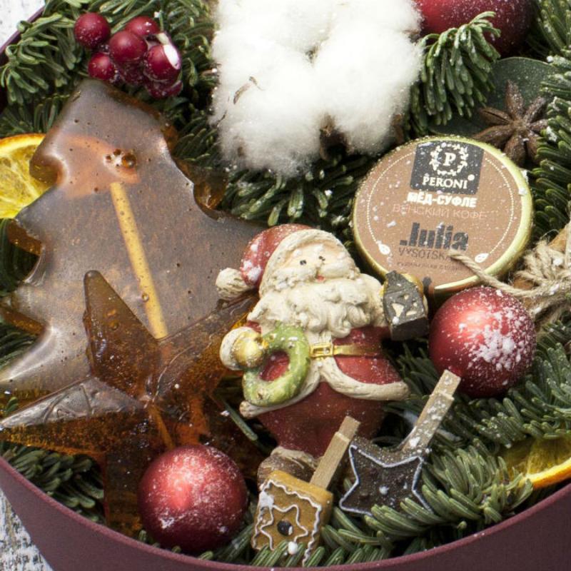 | Состав | мед-суфле, шишки, игрушка, новогодние прищепки 2шт., шарики, хлопок, леденец. |