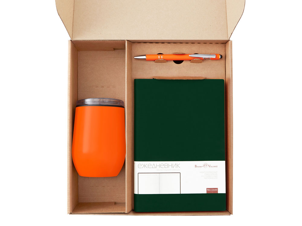Материал товара ежедневник - искусственная кожа, термокружка - нержавеющая сталь снаружи, полипропилен внутри, ручка - металл c покрытием софт-тач, ситечко - нержавеющая cталь