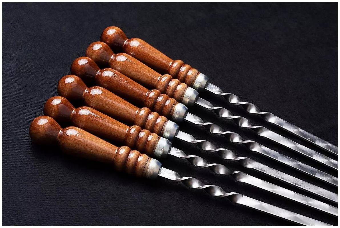 • Набор состоит из шести шампуров, изготовленных из высококачественной пищевой нержавеющей стали. В подарочный набор входят 6 шампуров. Рукоятки выполнены из натурального дерева