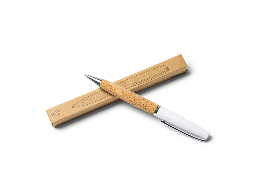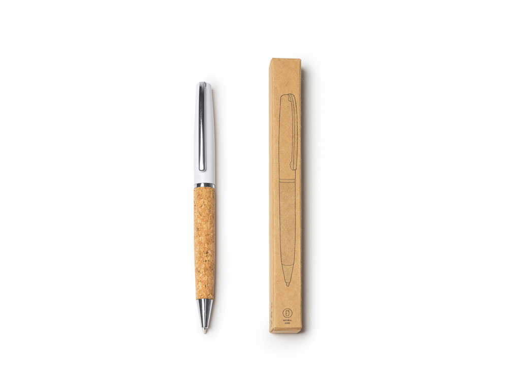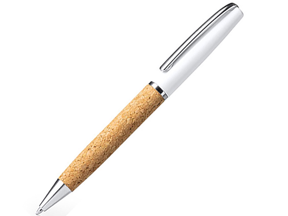 Шариковая ручка с поворотным стержнем, корпус из натуральной пробки и стали. Хромированные детали. Синие чернила.