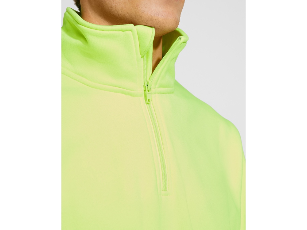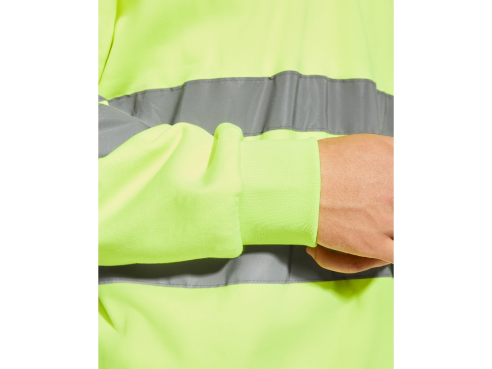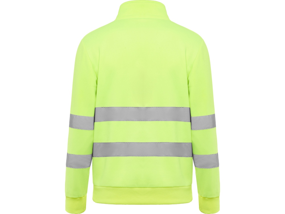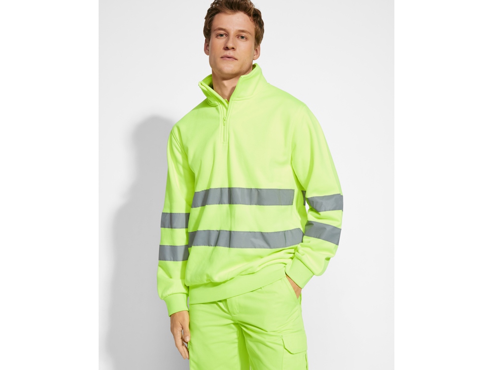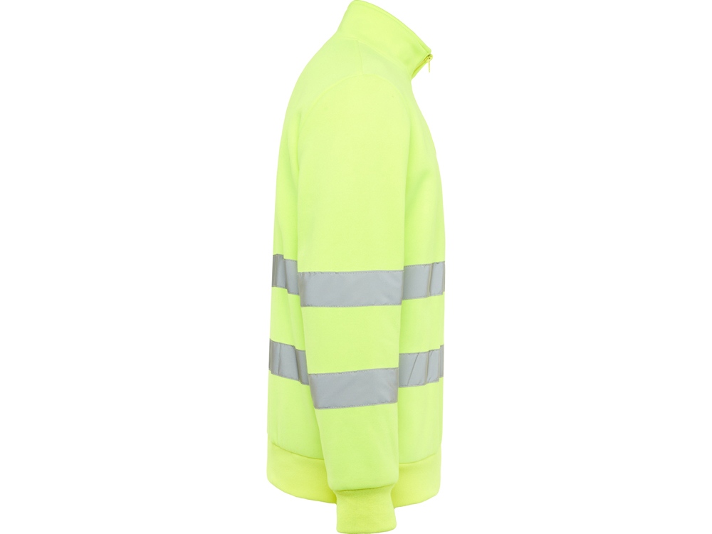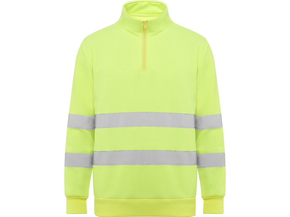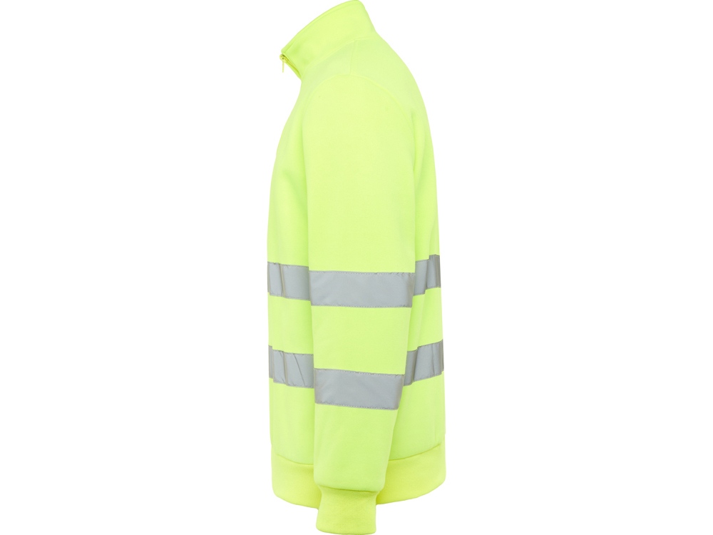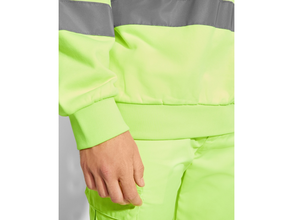 Свитшот с воротом на молнии, предназначен для использования в условиях плохой видимости. Внутри воротника отстрочка для усиления. Горизонтальные полоски со светоотражением на груди и рукавах. Манжеты и низ из рибовой ткани 1х1.