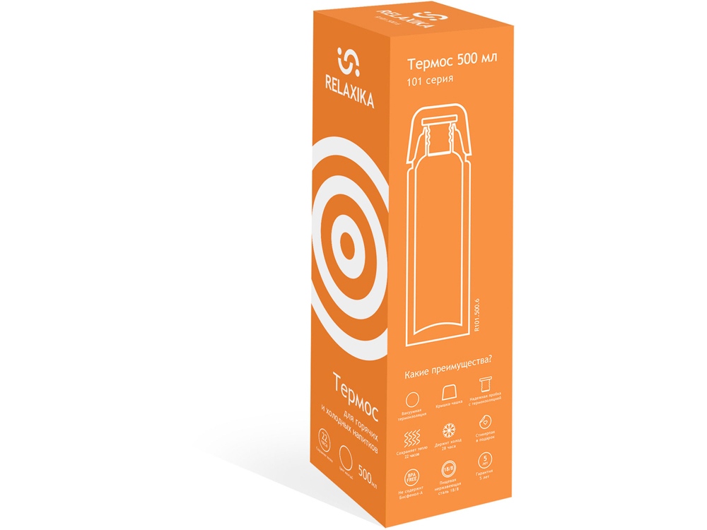 Классический термос Relaxika черного цвета с высокими показателями удержания температуры напитка для походов, путешествий, спорта и ежедневного использования. Прочные двойные стенки из высококачественной нержавеющей стали 18/8 с вакуумной изоляцией гарантируют, что ваш напиток останется холодным в течение 28 часов и горячим до 22 часов. Этот материал не только прочен, но и гигиеничен, не выделяет никаких вредных для здоровья веществ. Ваши напитки сохраняет естественный вкус и не приобретут посторонний запах. Напиток остается холодным до 28 часов и горячим до 22 часов. - Узкое горлышко позволяет удерживать температуру максимально долго - Крышку термоса можно использовать как чашку BPA Free. В пластмассах, используемых для производства термосов, отсутствует Бисфенол А - Надежная закручивающаяся пробка с силиконовым кольцом защищает от протекания и помогает удерживать температура - Высококачественная нержавеющая сталь 18/8 Рекомендации по уходу Не рекомендуется использовать посудомоечные машины при мытье изделия. Мойте мягкими губками и жидкими моющими средствами. Не используйте сухие абразивные средства чтобы не поцарапать поверхность. После мытья необходимо протереть сухой салфеткой или полотенцем и оставить сушиться без крышки. Не для микроволновой печи или морозильной камеры. Чтобы предотвратить утечку, тщательно закройте верхнюю крышку